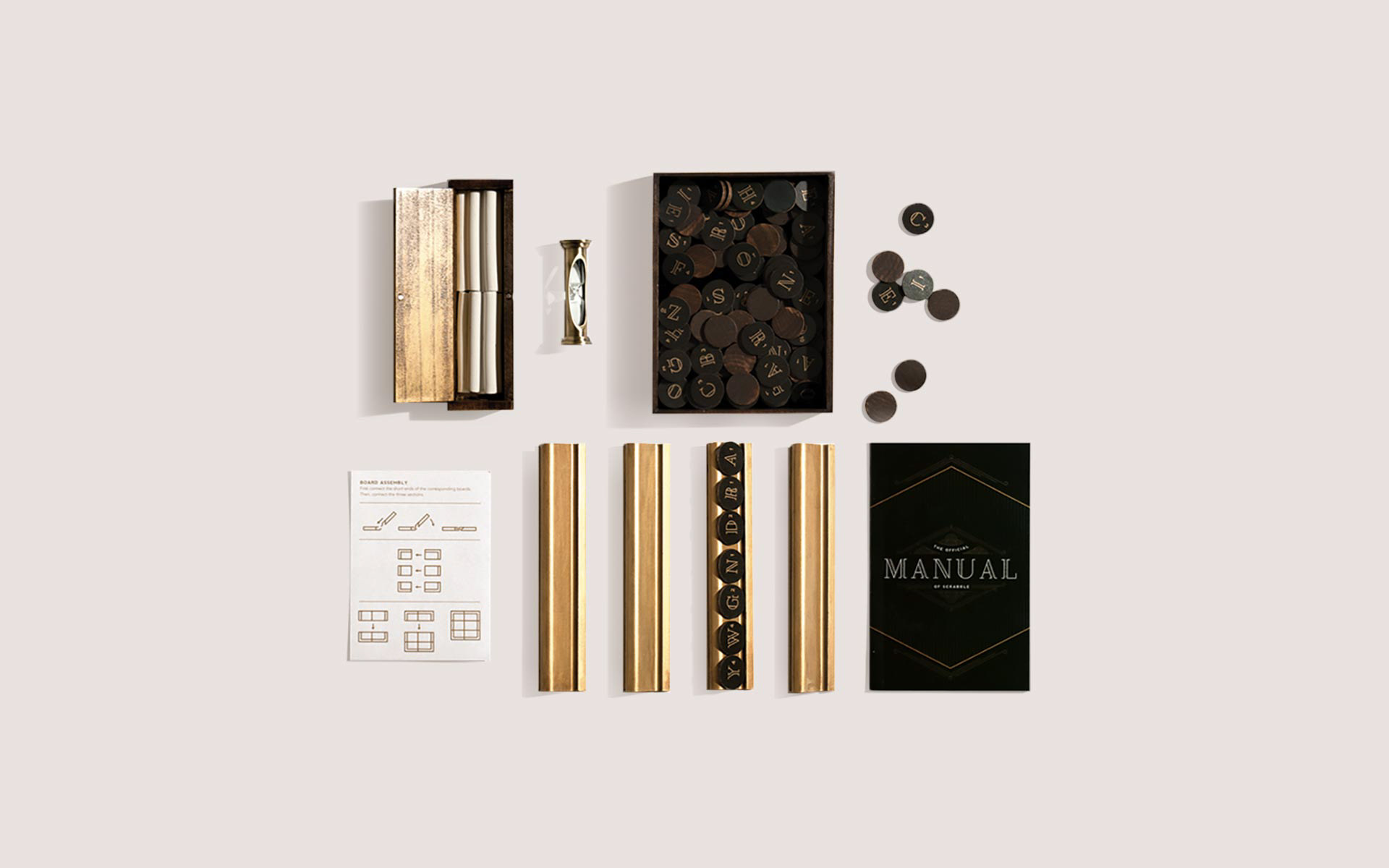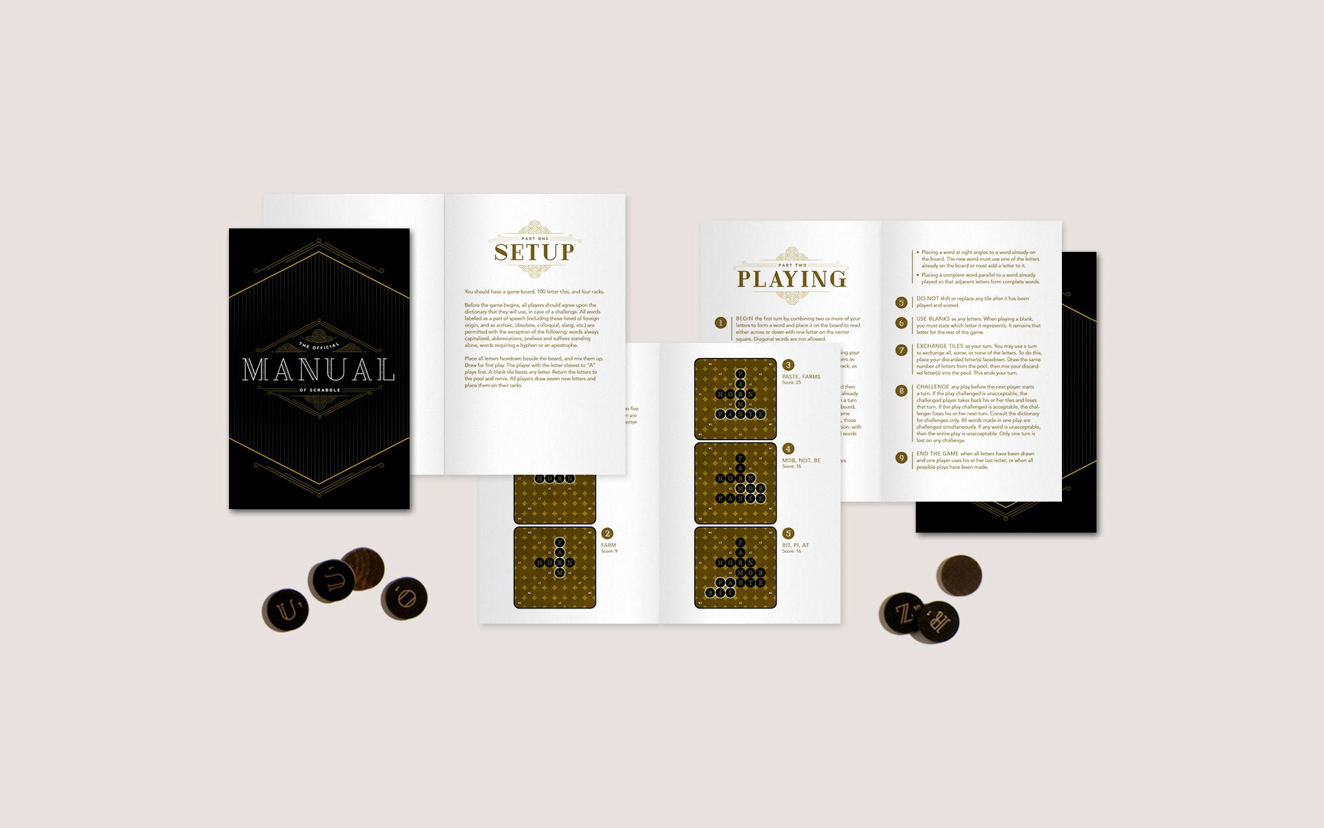 This art deco edition of the classic word game used historical design reference and physical materials to create an elegant game experience. The carefully crafted components unite to form a beautiful and functional product.