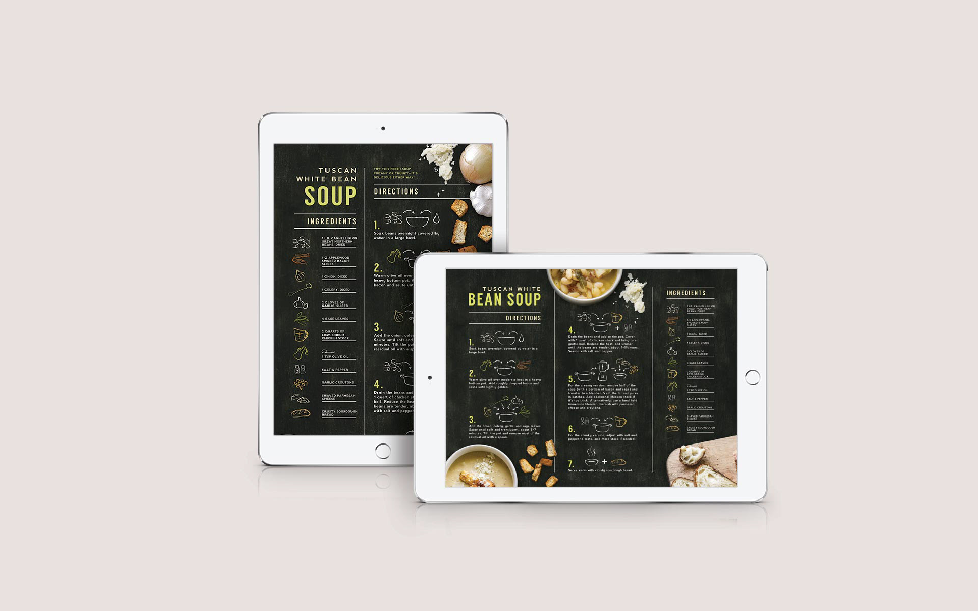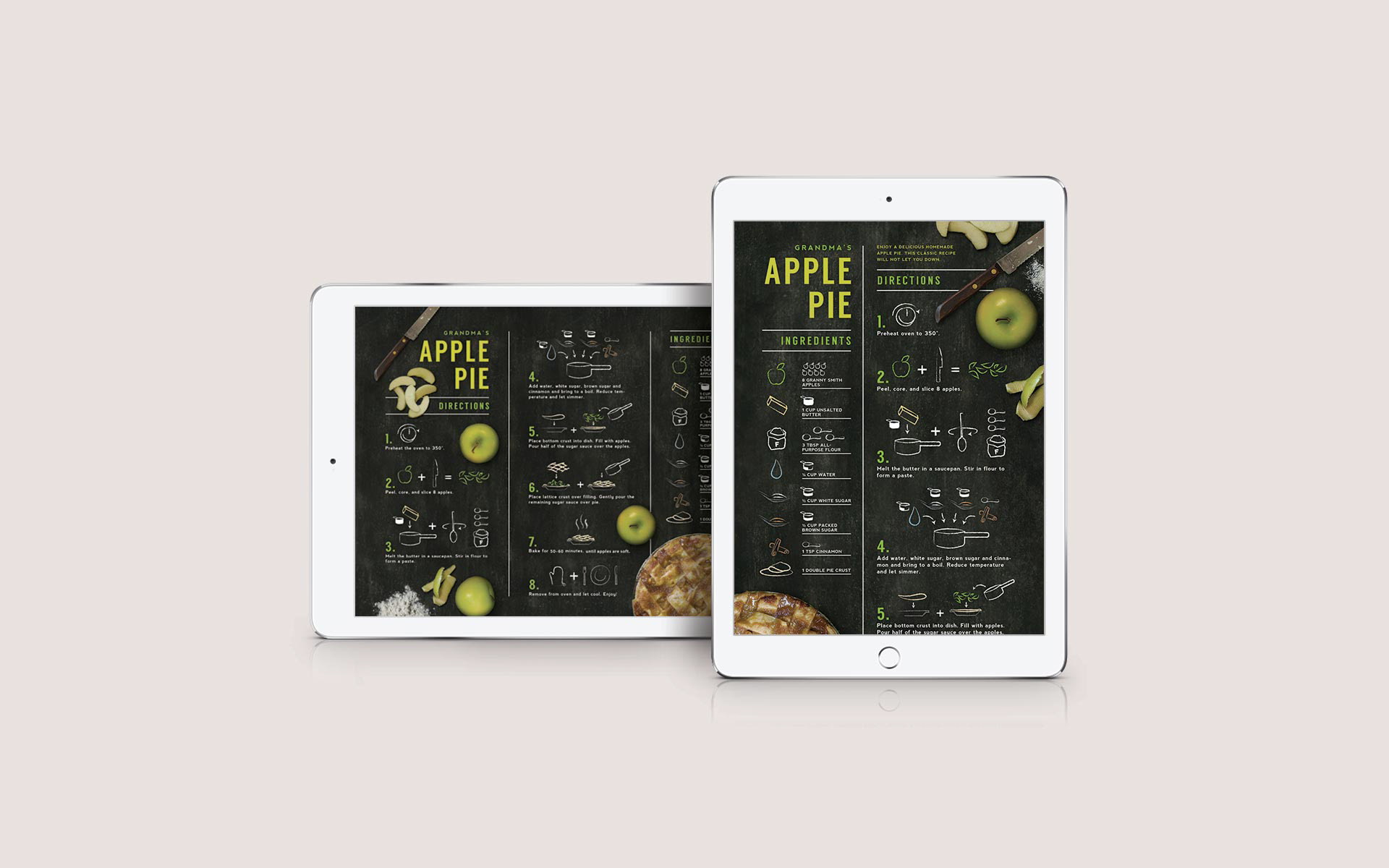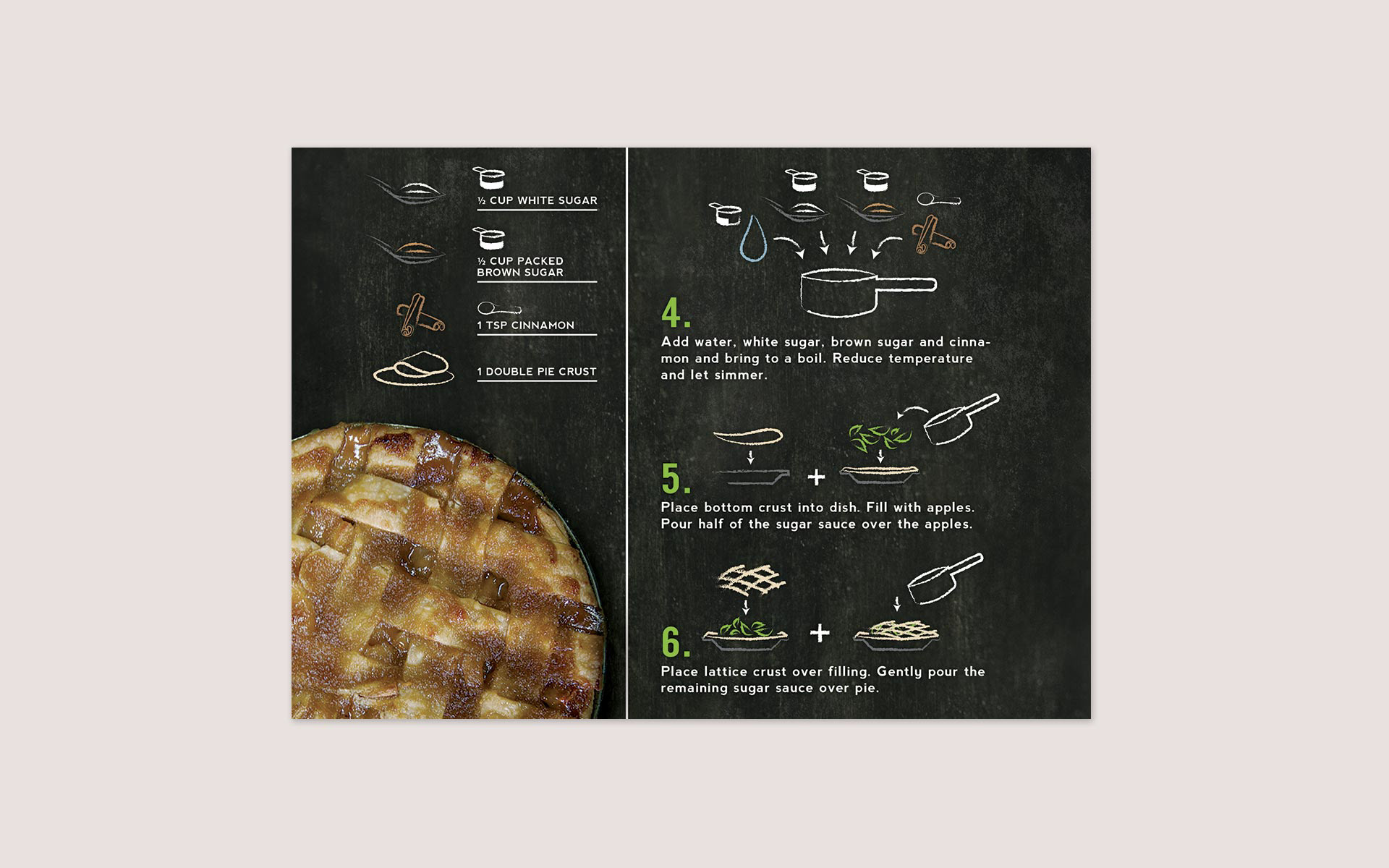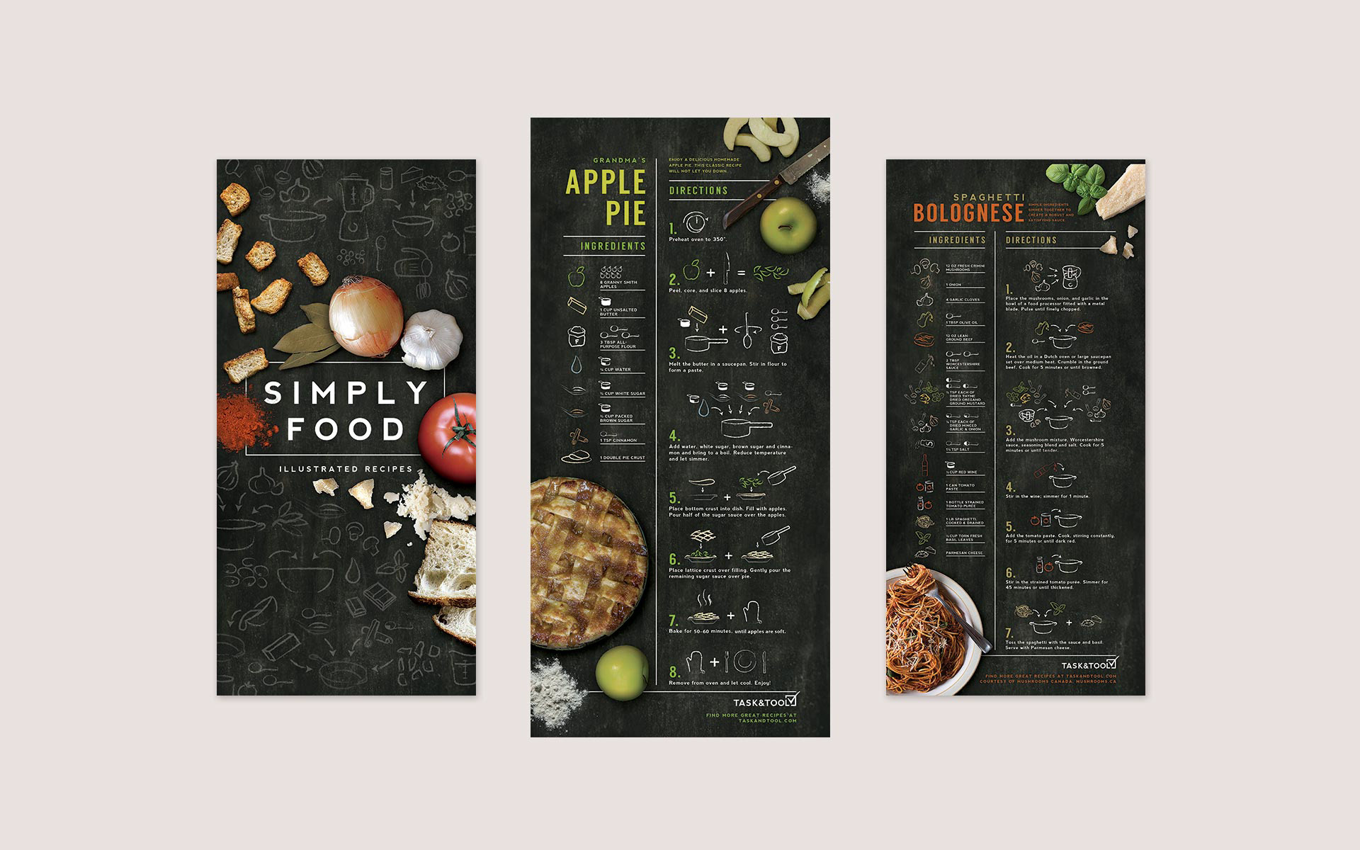 These infographic-style recipe cards were designed to make the task of cooking easier. They provide clear instructions at a glance by the use of colour and simplified illustrations. The chalkboard style and layout unifies the series.